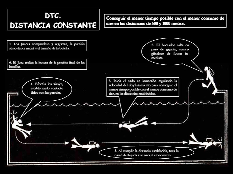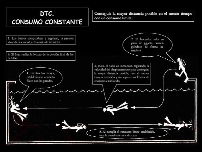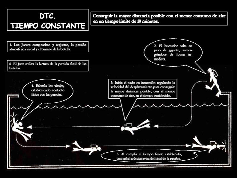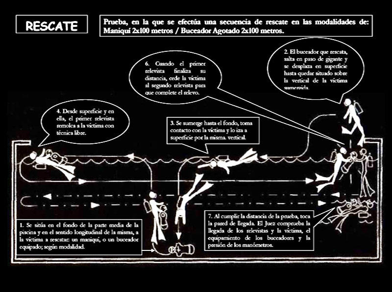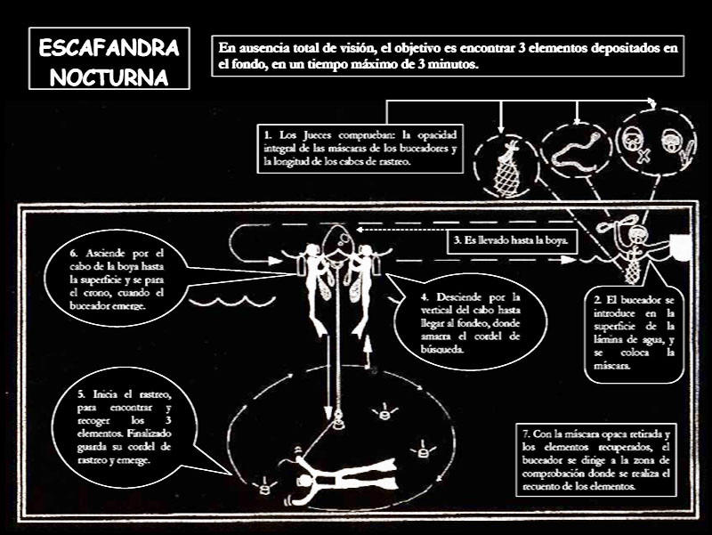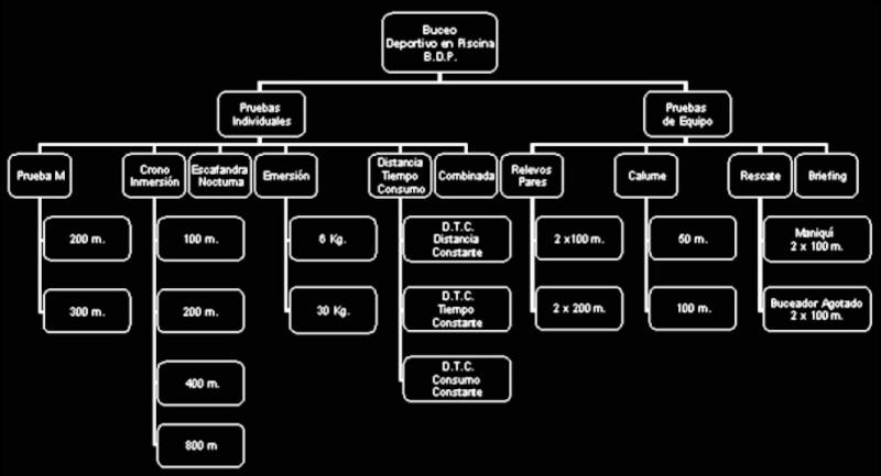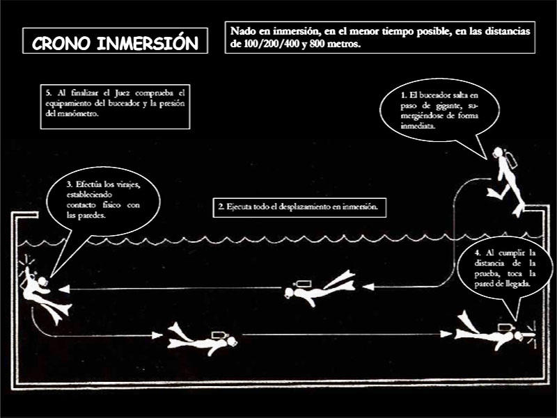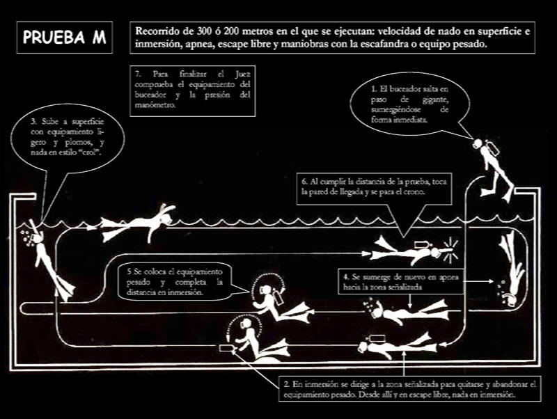 El reglamento contempla seis pruebas individuales y cuatro de equipo. Las individuales son: Prueba M 200 / 300 metros; Crono Inmersión 100/200/400/800 metros; Escafandra Nocturna; Emersión 6/30 Kg.;DTC Distancia-Tiempo-Consumo y la prueba Combinada.
