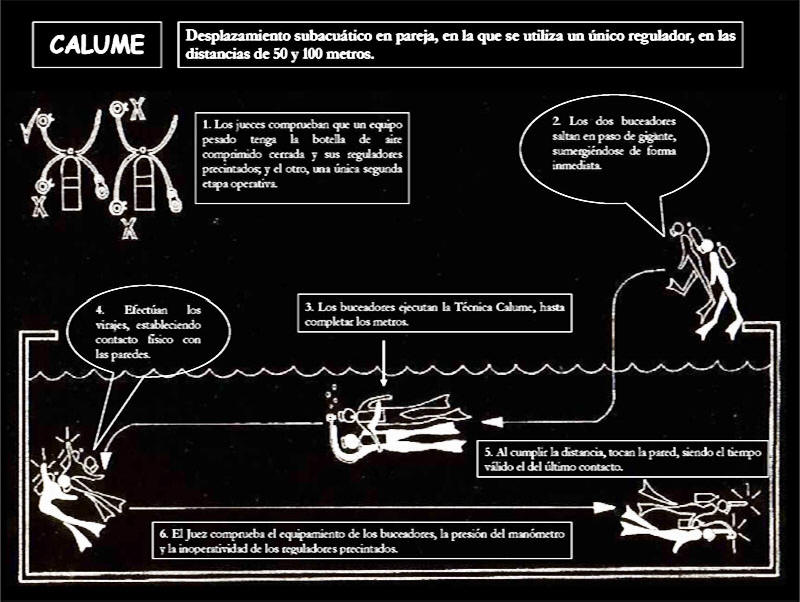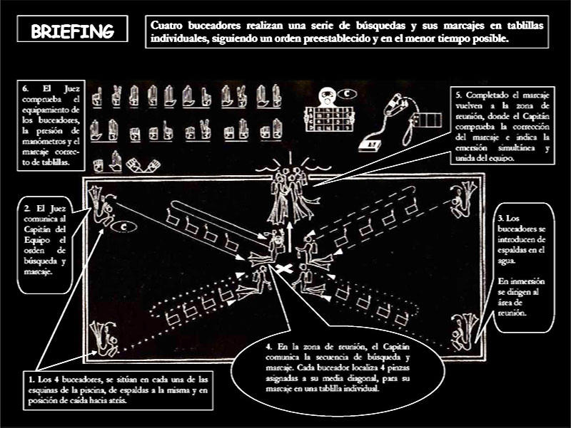 En las individuales el buceador tiene que poner en práctica diferentes destrezas como: tirarse al agua en paso de gigante o de espaldas, nadar tanto en superficie como inmersión, realizar apneas y escape libre, desprenderse de la escafandra, emerger pesos, buscar objetos perdidos en la oscuridad… También debe regular la velocidad, la potencia y en algunas ocasiones encontrar el equilibrio entre el gasto energético y el consumo de aire. Las 4 Pruebas de Equipo se denominan Relevos Pares 2x100/2x200 metros; Calume 50/100 metros; Rescate: Maniquí 2x100 metros/ Buceador Agotado 2x100 metros y la prueba Briefing. En las de equipo el referente de la pareja es importante y se fortalece la cooperación y el concepto de grupo.