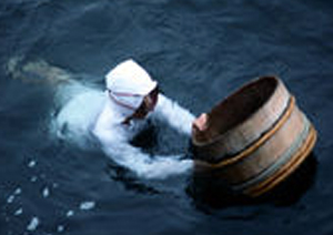 mujeres se dedican a la recolección de perlas a pulmón. El aprendizaje de las apneistas ya empezaba a pronta edad, ayudando a preparar los utensilios necesarios para la recolección de las ostras, asi como acompañando a sus madres en la embarcación o en tierra. Las jóvenes apneistas empezaban por inmersiones a poca profundidad sobre los 7 mts. A estas jóvenes Amas se les denominaba " kachido " realizando de media unas veinte o treinta inmersiones al día. Con el tiempo y después de adquirir un gran nivel pasan a denominarse Funado. Una Funado adulta en plena forma es capaz de hacer inmersiones a mas de 25 mts. con duraciones superiores al minuto y medio. |